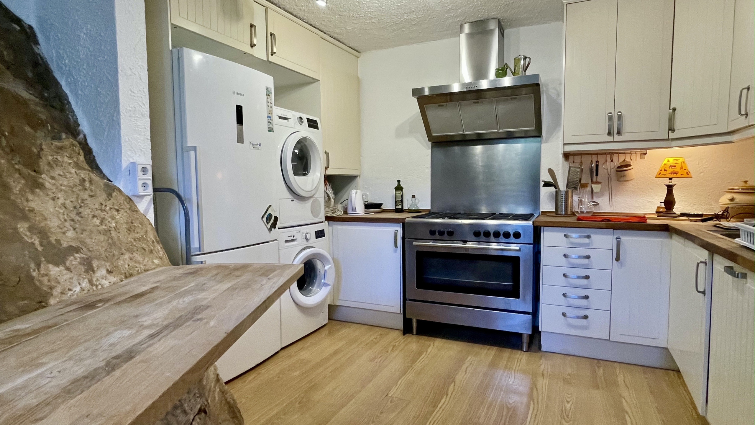 The open-plan kitchen, renovated in 2023, is fully equipped with a refrigerator, microwave, oven, freezer, dishes/cutlery, kitchen utensils, coffee maker, and toaster, allowing you to prepare your own meals if desired.