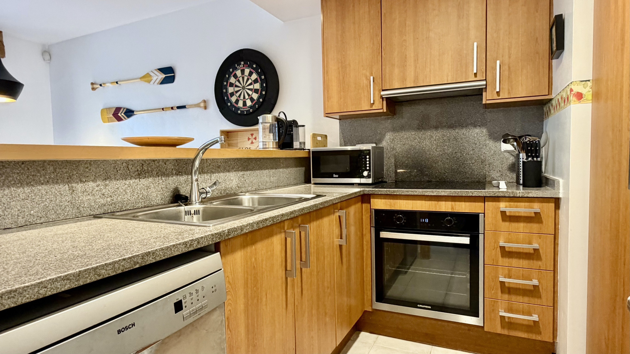 The interior stands out for its functionality and comfort. The American kitchen is fully equipped with state-of-the-art appliances, including fridge, oven, microwave, dishwasher and coffee machine. Additionally, it has a fireplace for cooler nights, iron and two televisions for family entertainment. It does NOT have a washing machine.