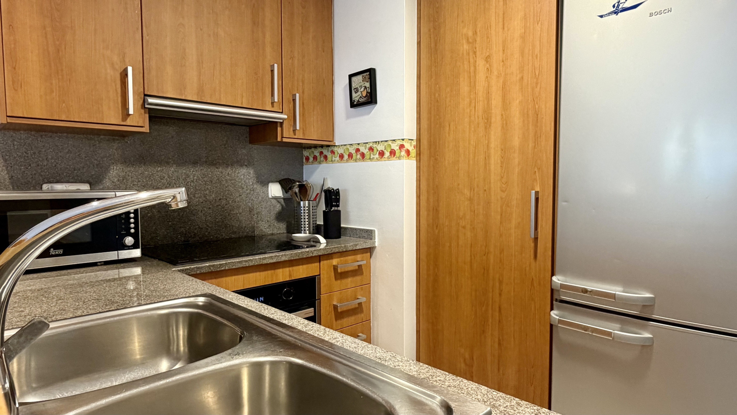 In the kitchen, refrigerator, microwave, oven, freezer, washing machine, dishes/cutlery, kitchen utensils, coffee machine and toaster are provided.