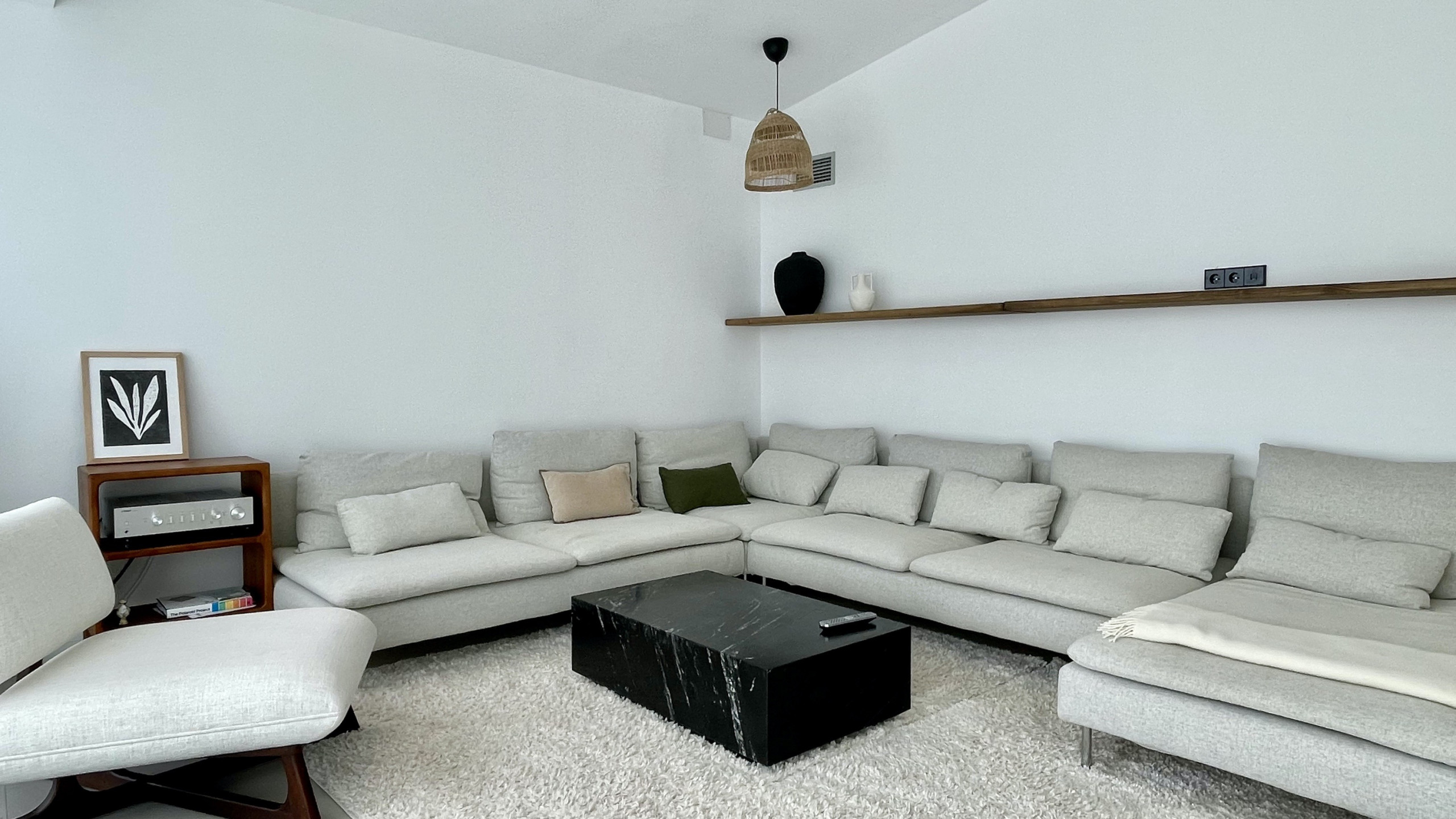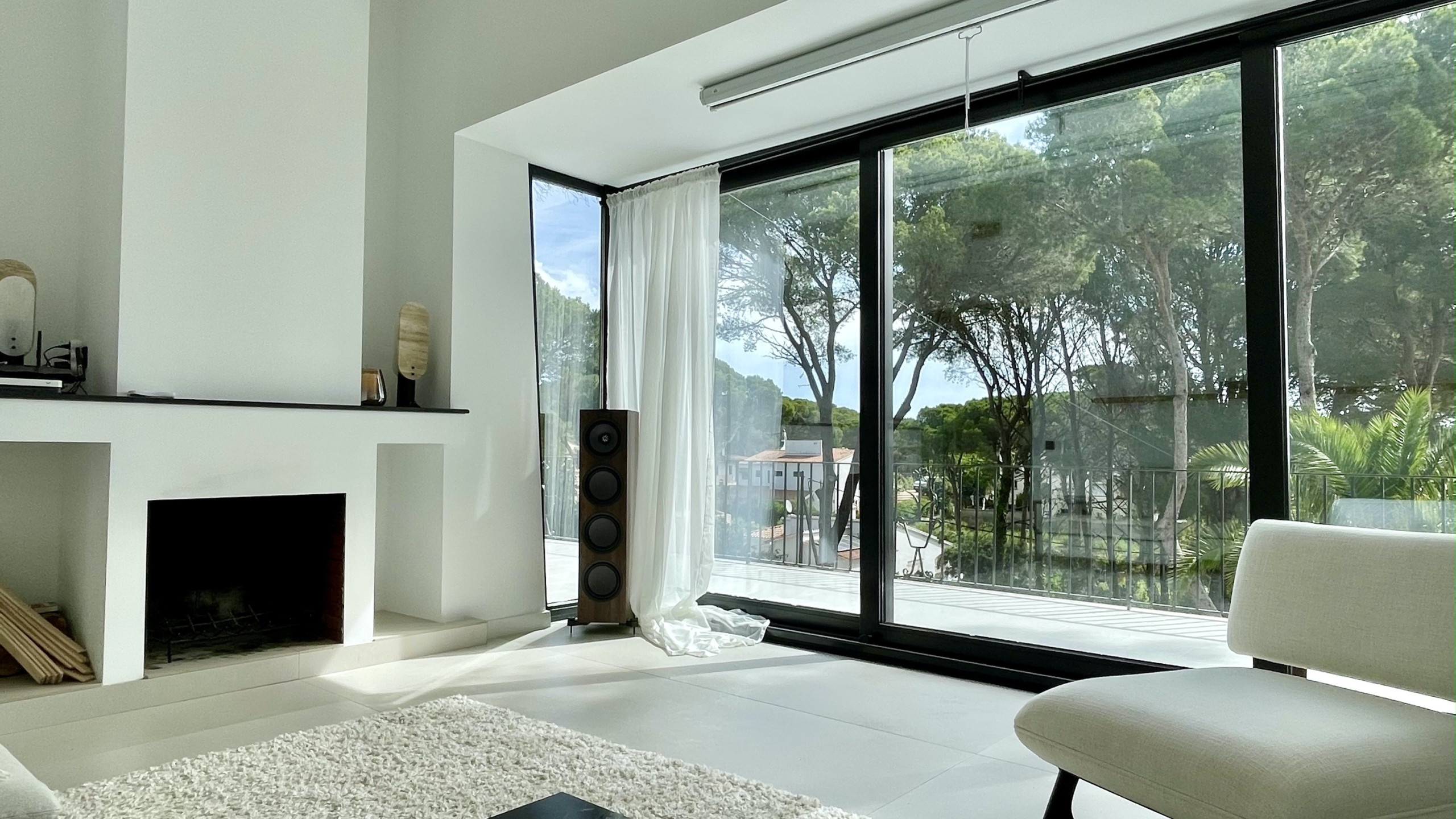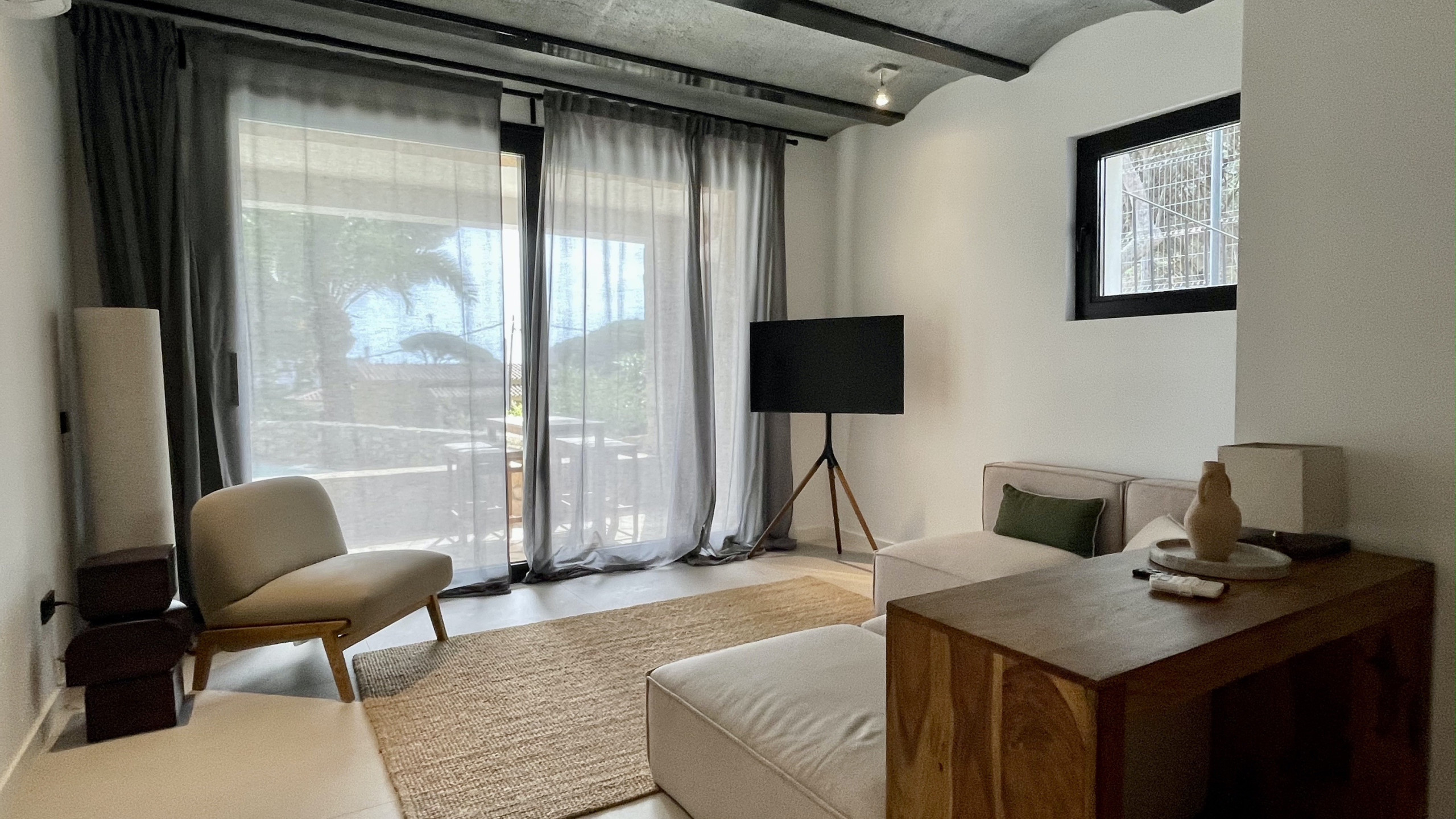Spacious living room with projector, surround sound and terrace with sea views