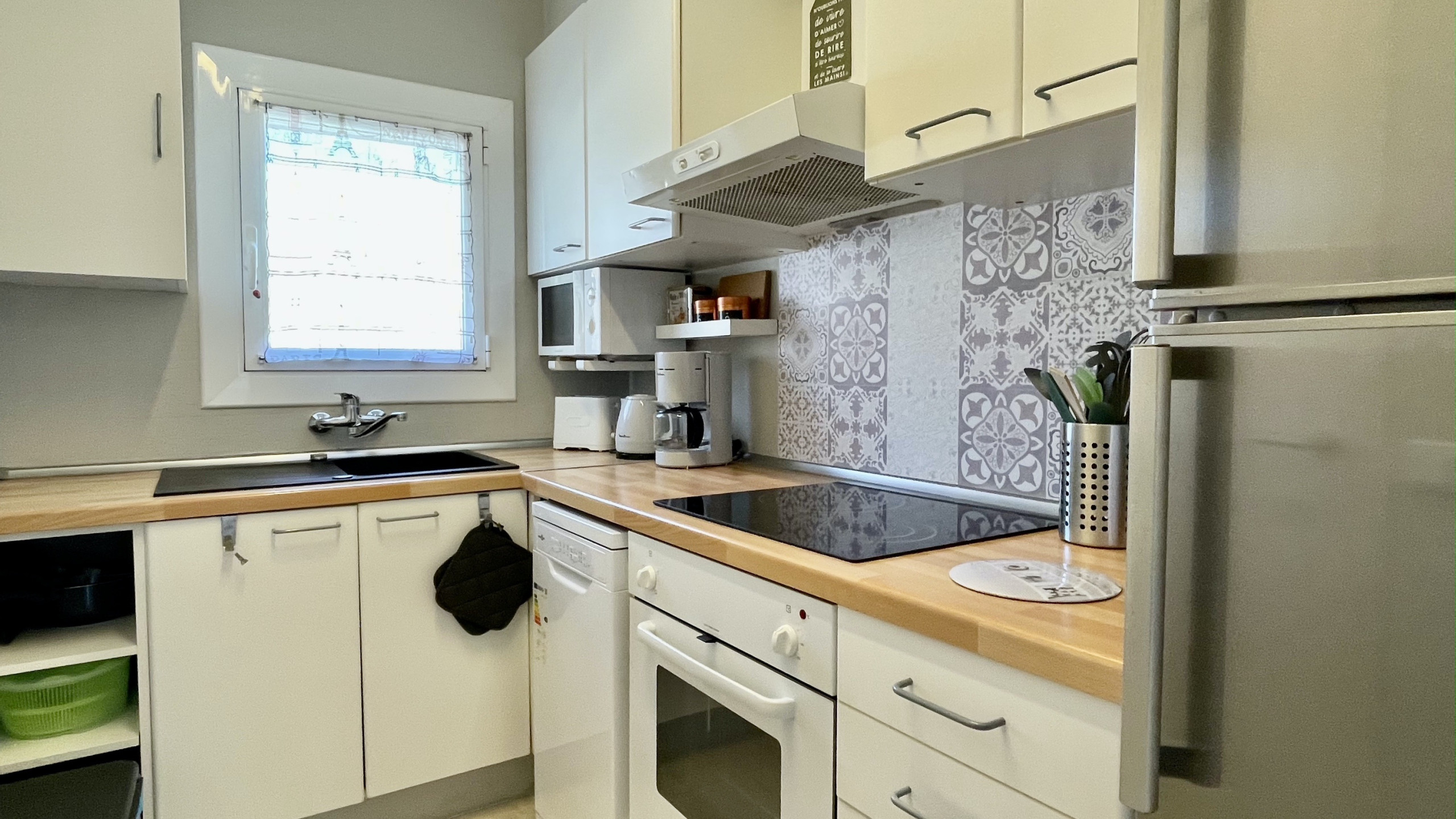 La cuisine indépendante est entièrement équipée d'appareils électroménagers modernes tels que réfrigérateur, machine à laver, four, micro-ondes, lave-vaisselle, cafetière, grille-pain, bouilloire et presse-agrumes. Parfaite pour préparer des repas familiaux et profiter de moments ensemble.