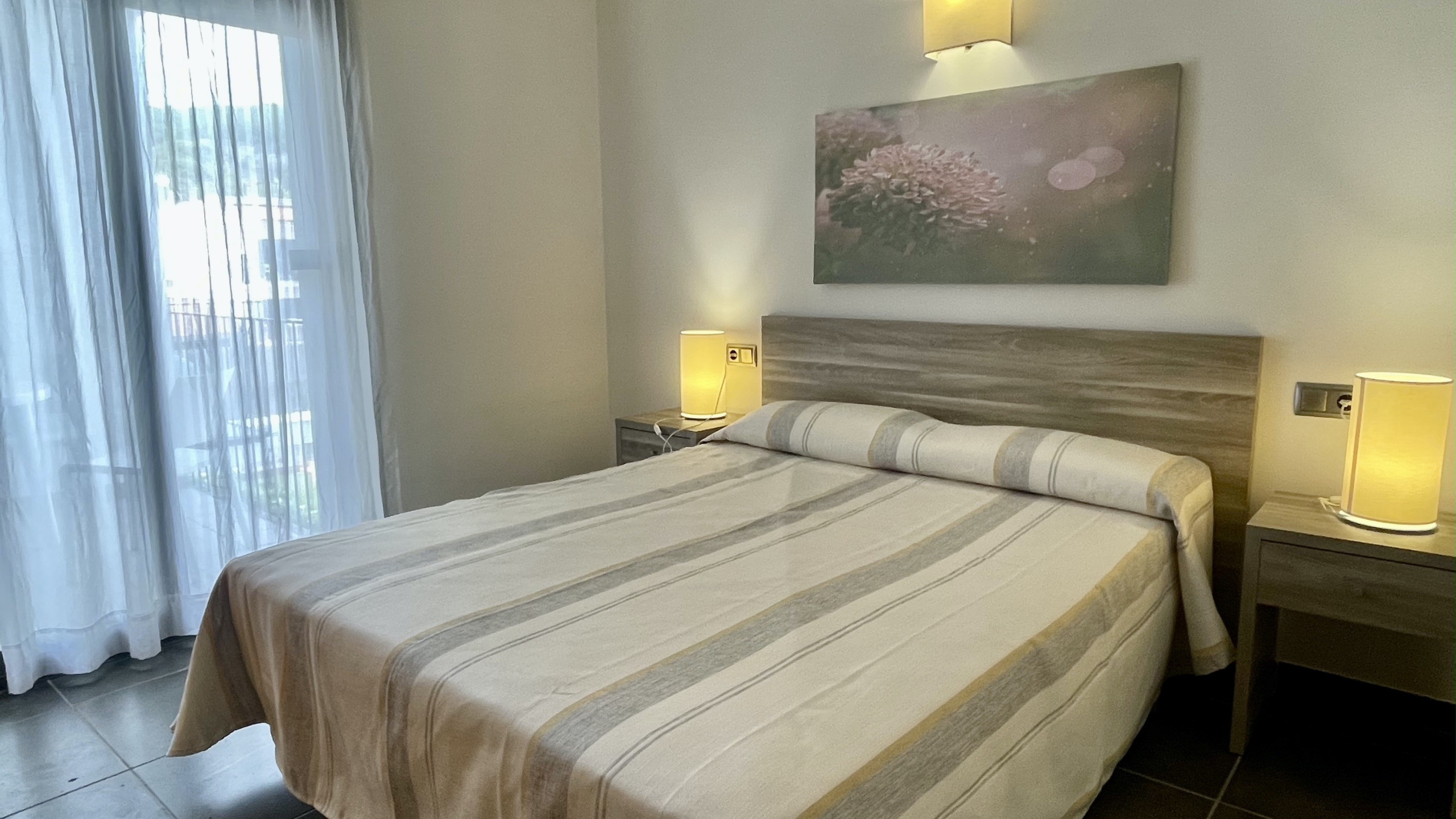L'appartement dispose de deux chambres bien réparties : une chambre principale avec un lit double et une autre avec deux lits individuels, ainsi qu'un canapé-lit qui permet d'accueillir plus de personnes. L'espace commun est spacieux et lumineux, avec une cuisine américaine entièrement équipée qui facilitera la préparation des repas familiaux.