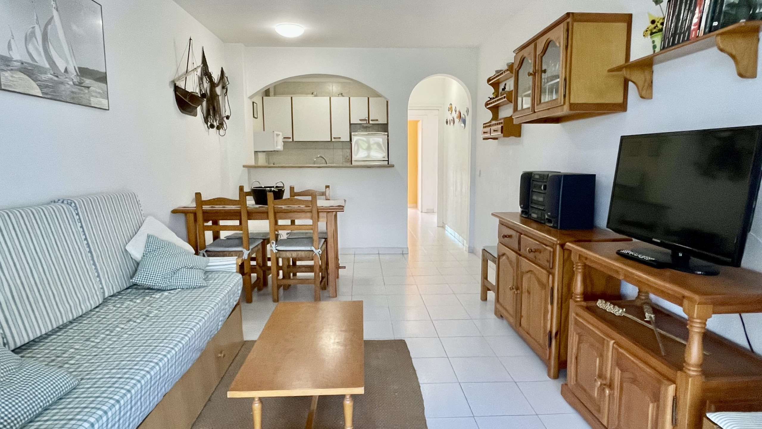 Équipé de toutes les commodités modernes, l'appartement comprend un ascenseur, un lave-linge, un fer à repasser, un chauffage par pompe à chaleur et la climatisation. La propriété offre également un accès à une piscine communautaire et pour enfants, parfaite pour profiter d'une baignade rafraîchissante lors des journées ensoleillées. Pour votre divertissement, une télévision est fournie.
