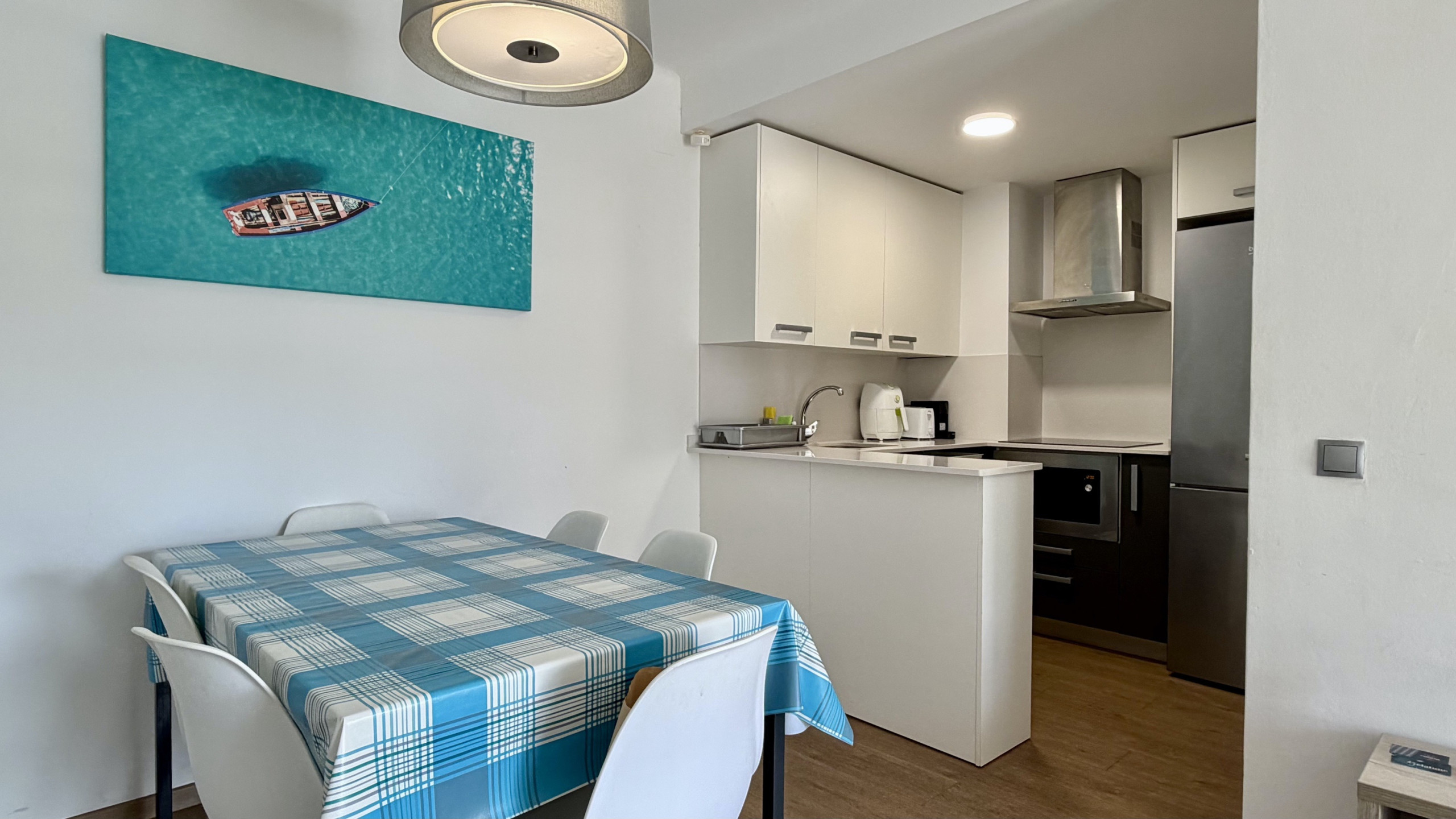 L'appartement dispose d'une cuisine américaine entièrement équipée, idéale pour préparer des repas en famille. Il comprend des appareils électroménagers modernes tels que réfrigérateur, congélateur, machine à laver, lave-vaisselle, four, friteuse, grille-pain et machine à café. La zone de cuisine est conçue pour faciliter la préparation des repas et partager des moments ensemble.