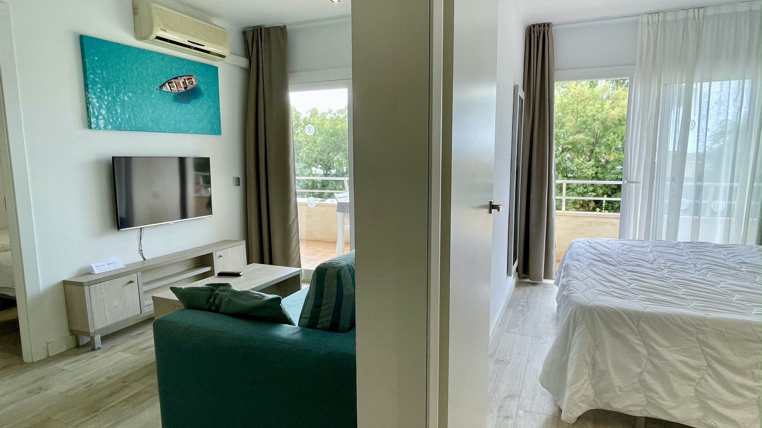 Dans le complexe Rocamaura, cet appartement d'une chambre est disponible à la location pour les vacances, avec un lit superposé double et un lit simple pouvant accueillir jusqu'à 3 personnes. Il comprend un salon-salle à manger avec un canapé et une télévision, une petite cuisine indépendante et une salle de bains avec douche.