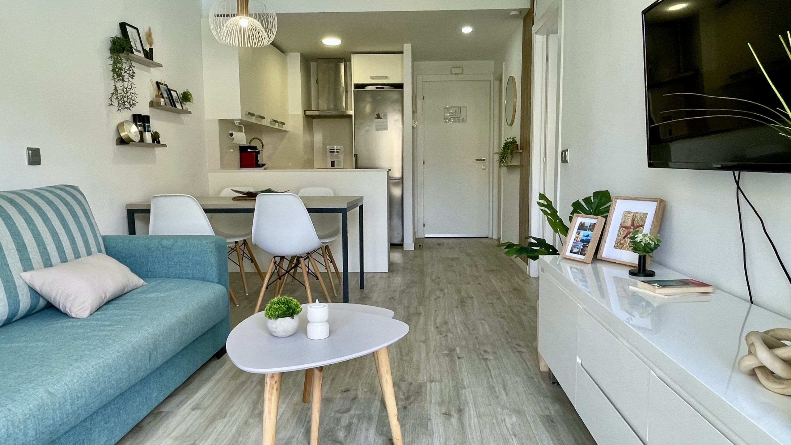 Dans le complexe Rocamaura, cet appartement d'une chambre est disponible à la location pour les vacances, avec un lit superposé double et un lit simple pouvant accueillir jusqu'à 3 personnes. Il comprend un salon-salle à manger avec un canapé et une télévision, une petite cuisine indépendante et une salle de bains avec douche.