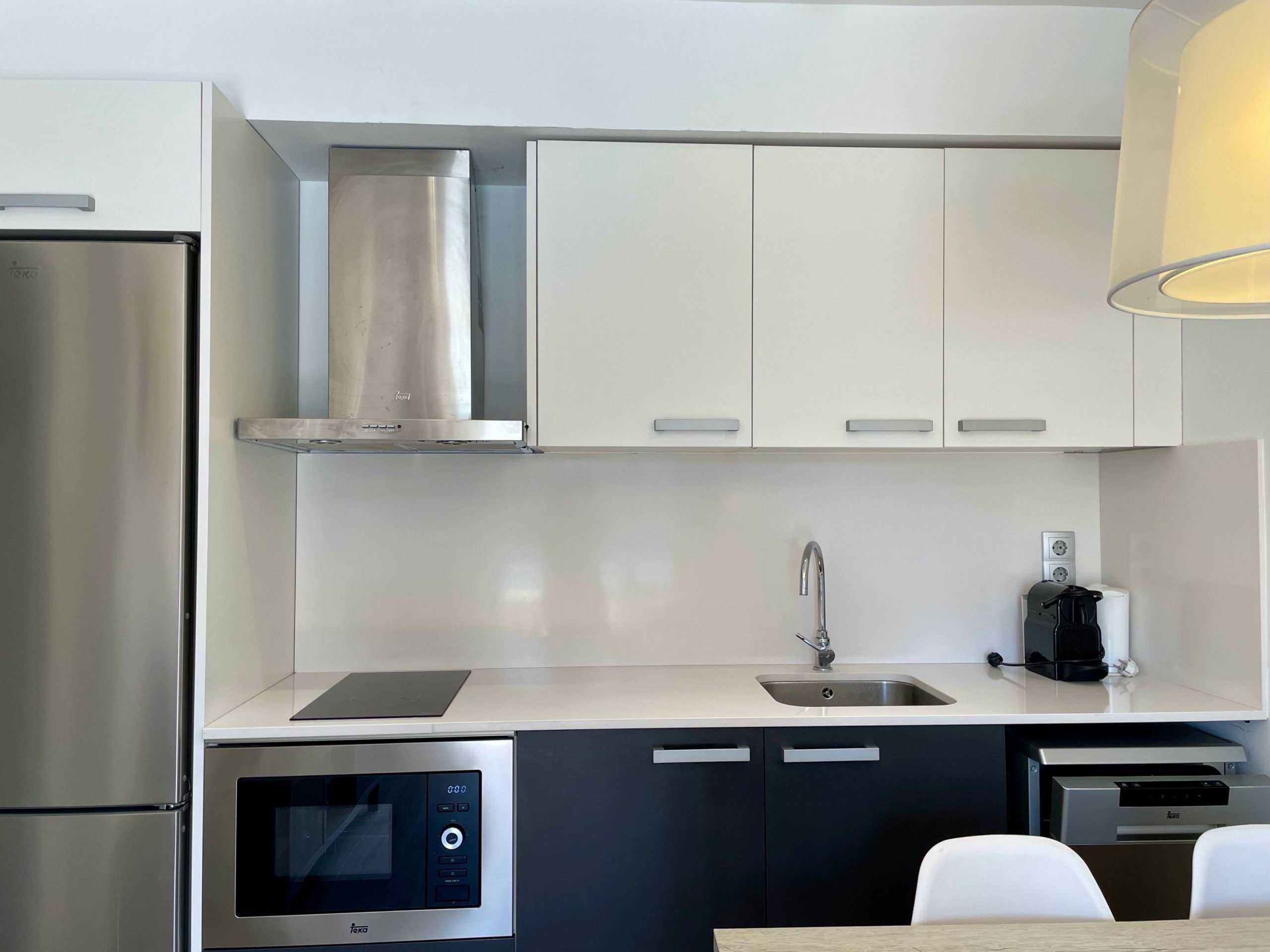 La cuisine américaine est équipée d'un système de cuisson en vitrocéramique, et vous trouverez une large gamme d'appareils tels qu'un réfrigérateur, un micro-ondes, un congélateur, une machine à laver et un lave-vaisselle. De plus, des assiettes, des couverts, des ustensiles de cuisine, une cafetière et un grille-pain sont fournis pour votre usage. Les draps sont inclus dans le prix et des serviettes peuvent être ajoutées pour 5€/personne.