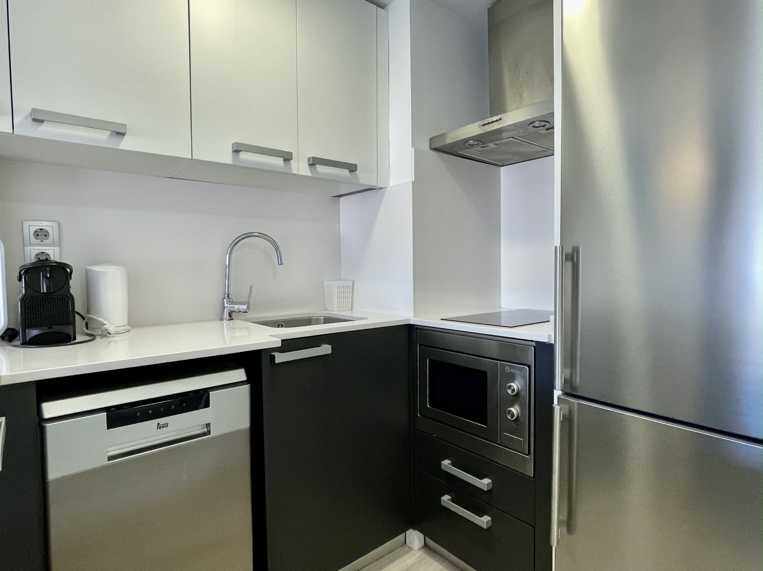 La cuisine américaine, équipée d'un système de cuisson en vitrocéramique, est entièrement équipée avec les appareils essentiels tels qu'un réfrigérateur, un micro-ondes, un congélateur, une machine à laver, un lave-vaisselle, ainsi que de la vaisselle, des couverts, des ustensiles de cuisine, une cafetière et un grille-pain. Les draps sont inclus dans le prix, et des serviettes peuvent être ajoutées pour 5€/personne.