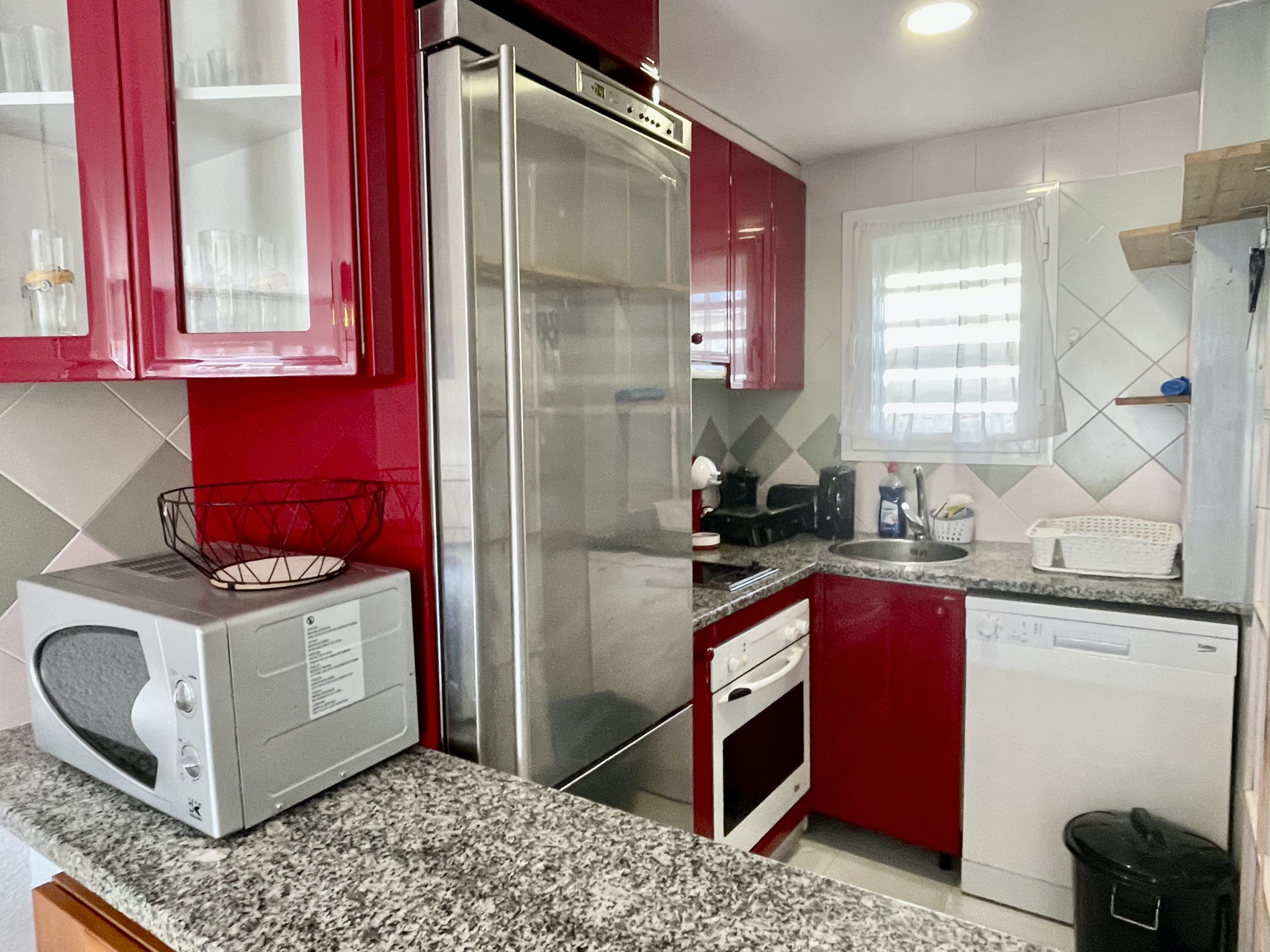 La cuisine américaine, à vitrocéramique, est équipée avec réfrigérateur, micro-ondes, four, congélateur, lave-linge, lave-vaisselle, vaisselle/couverts, ustensiles/cuisine, cafetière, grille pain, bouilloire et presse-agrumes.