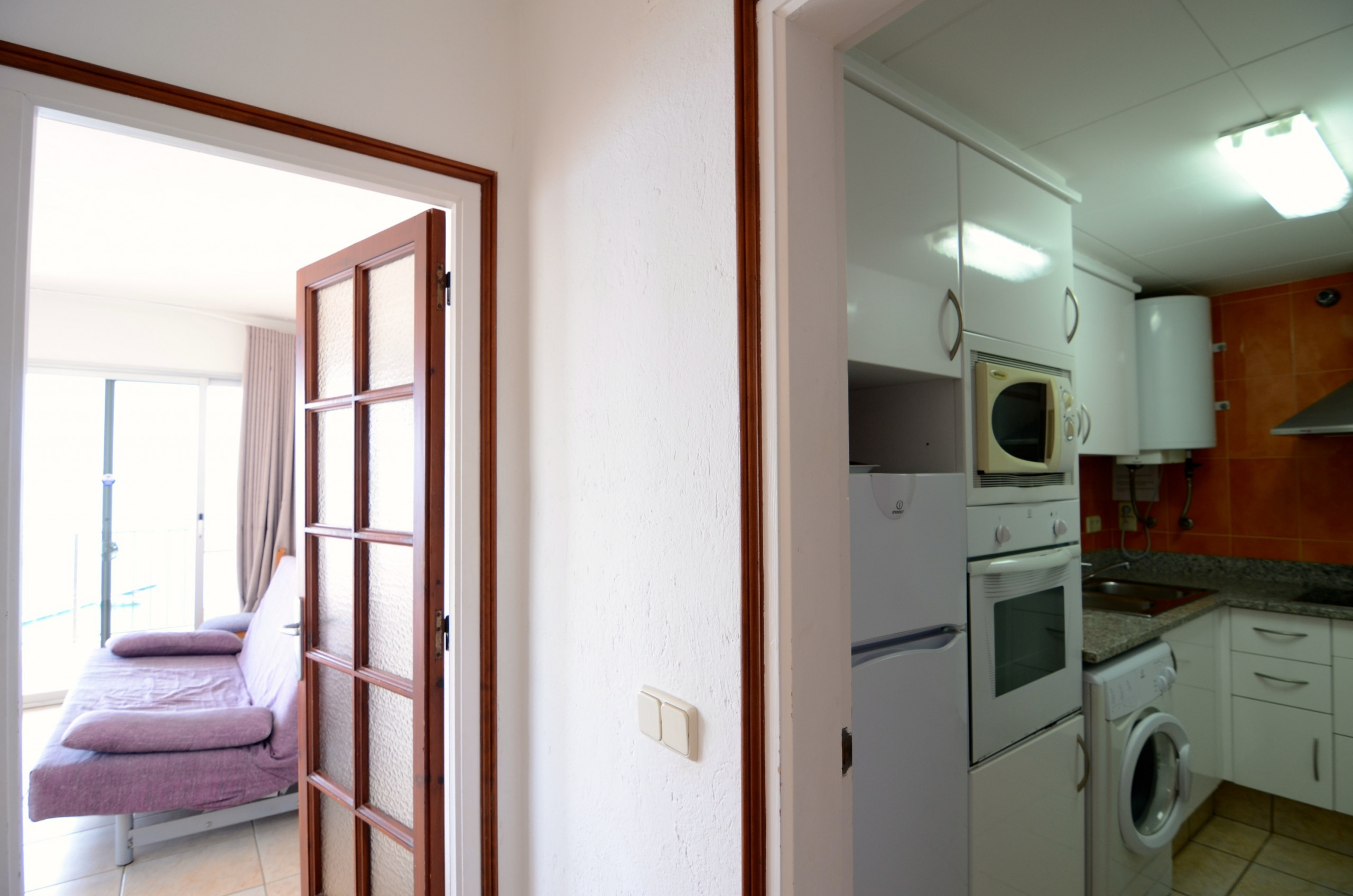 Dans le complexe Rocamaura, cet appartement d'une chambre est disponible à la location pour les vacances, avec un lit superposé double et un lit simple pouvant accueillir jusqu'à 3 personnes. Il comprend un salon-salle à manger avec un canapé et une télévision, une petite cuisine indépendante et une salle de bains avec douche.