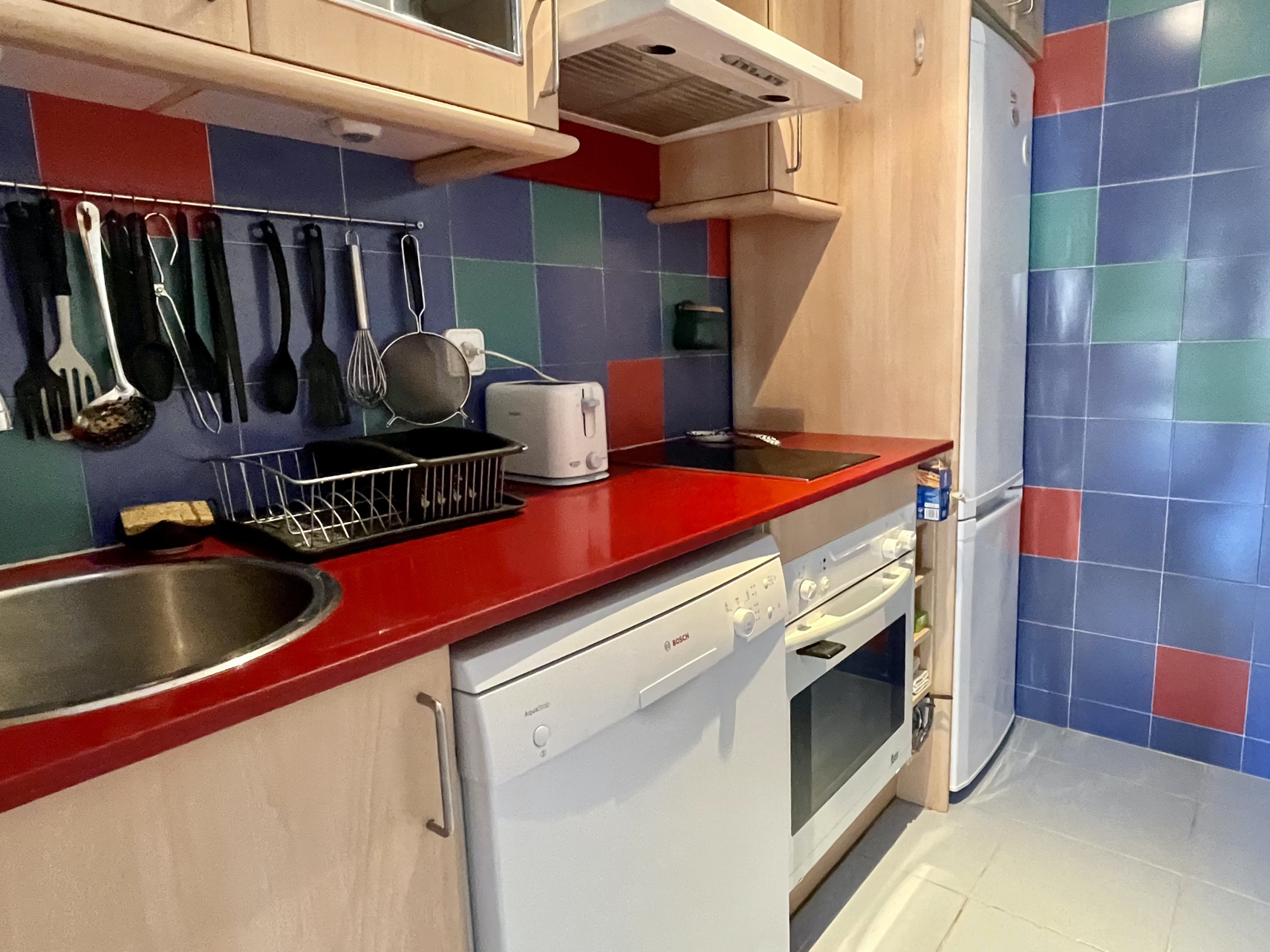 L'appartement dispose d'une cuisine entièrement équipée avec une plaque vitrocéramique, un réfrigérateur, un four, un congélateur, une machine à laver, un lave-vaisselle, une cafetière et un grille-pain.