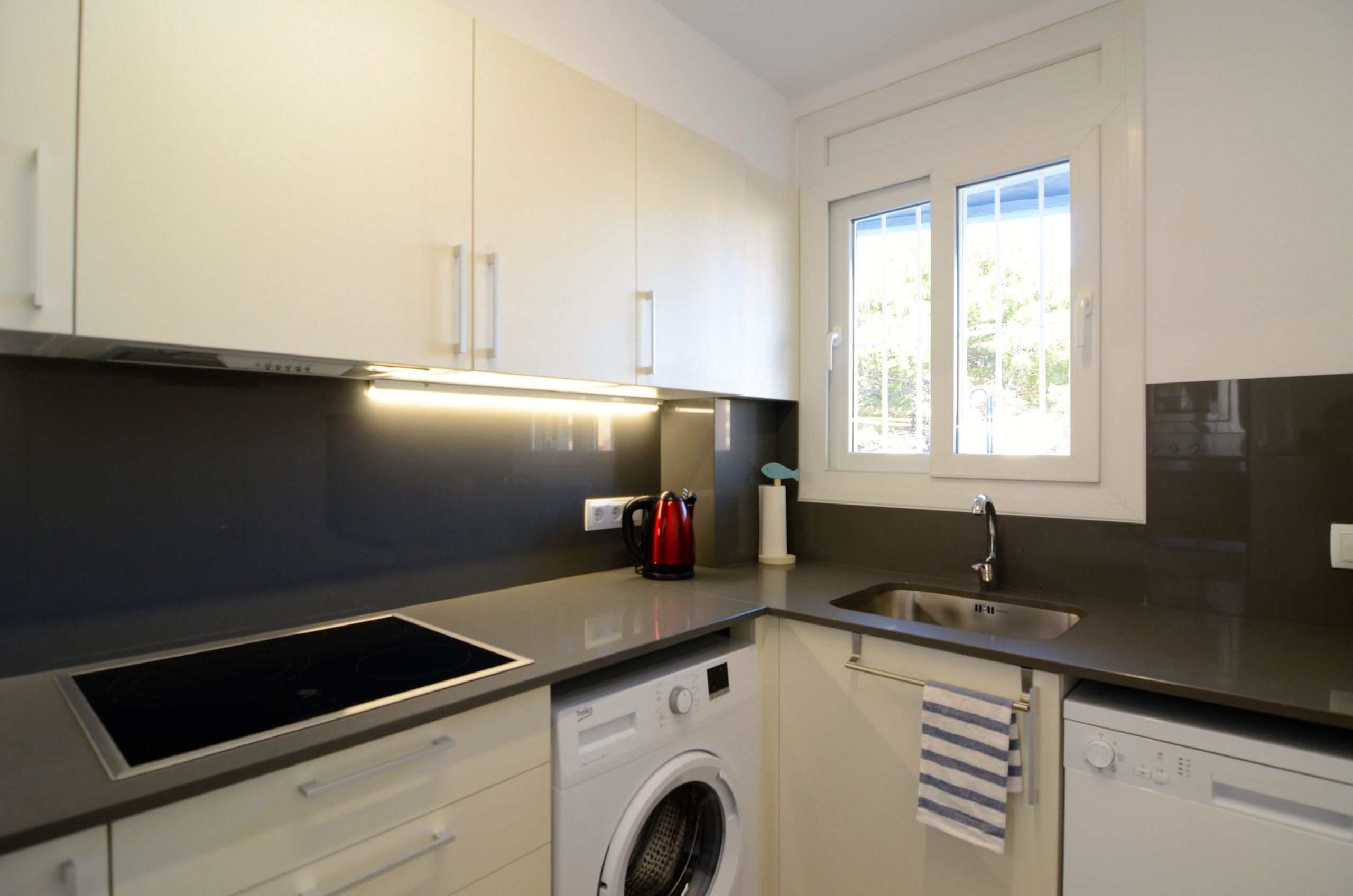 La cuisine séparée, équipée d'appareils en vitrocéramique, comprend un réfrigérateur, un micro-ondes, un four, un congélateur, une machine à laver, un lave-vaisselle, de la vaisselle/couverts, des ustensiles de cuisine, une cafetière, une poêle, un grille-pain, une bouilloire et un presse-agrumes.