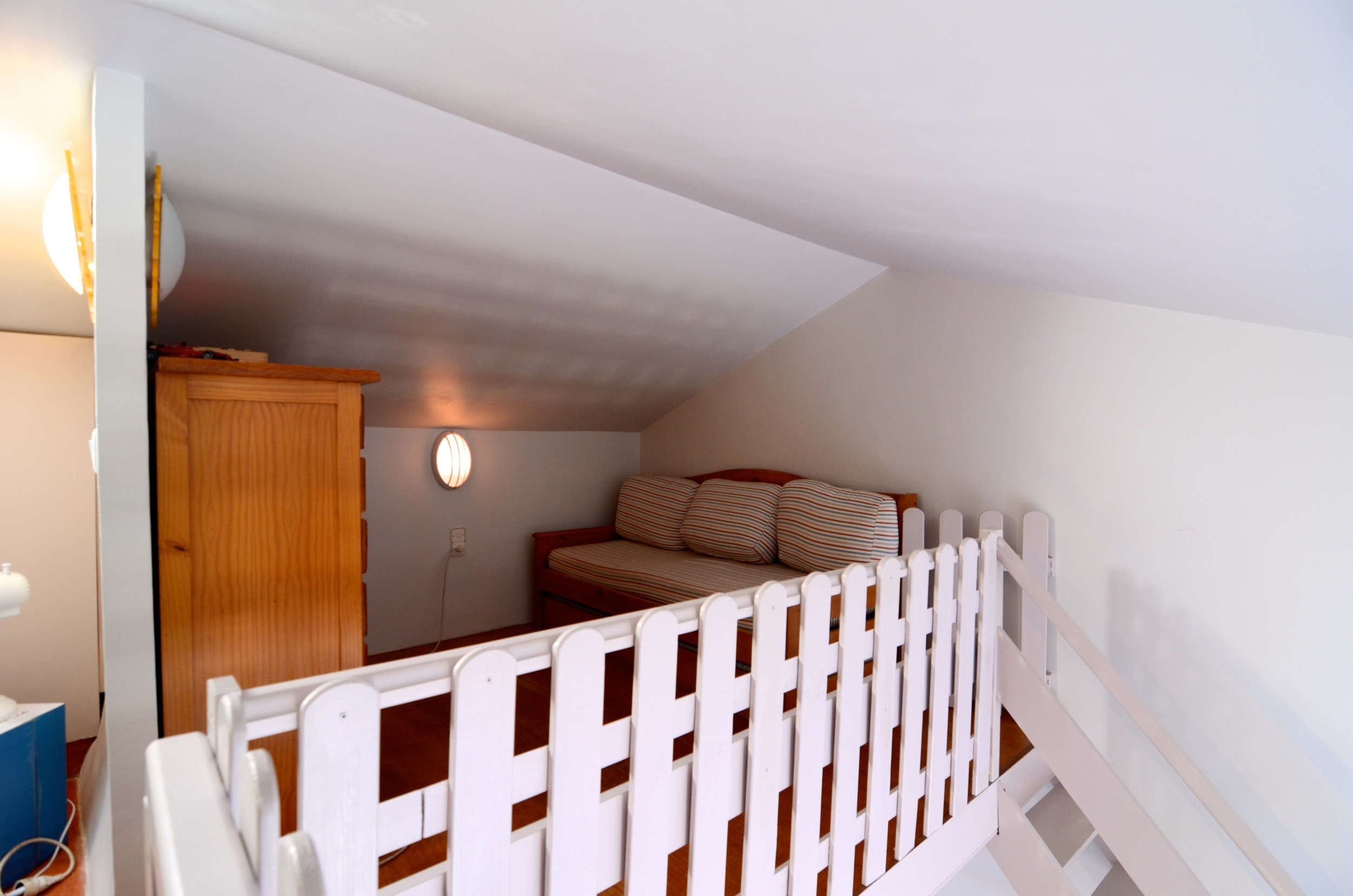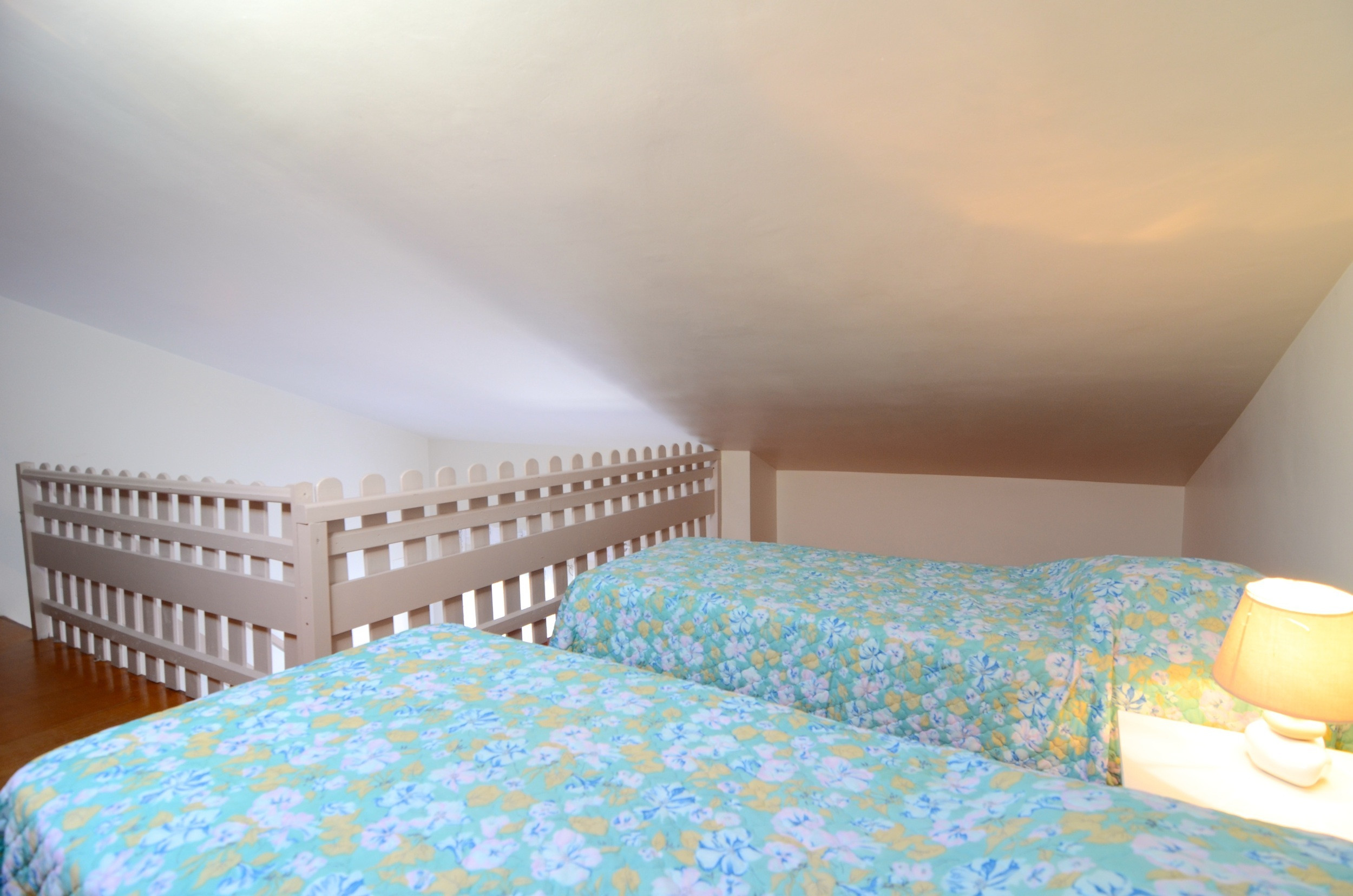 En montant à l'étage supérieur, vous serez surpris par deux lits simples confortables et un petit salon équipé d'un canapé-lit pratique et d'une télévision, parfait pour se détendre après une journée de plaisir à la plage.