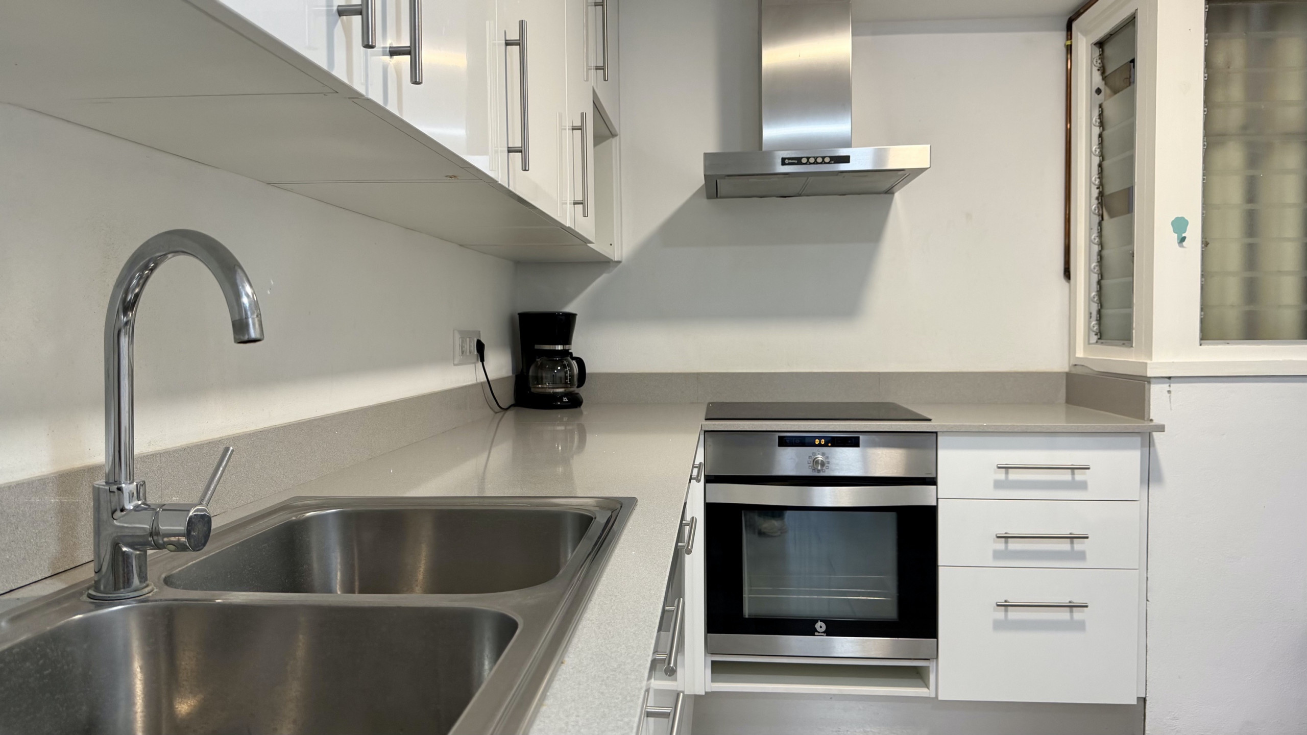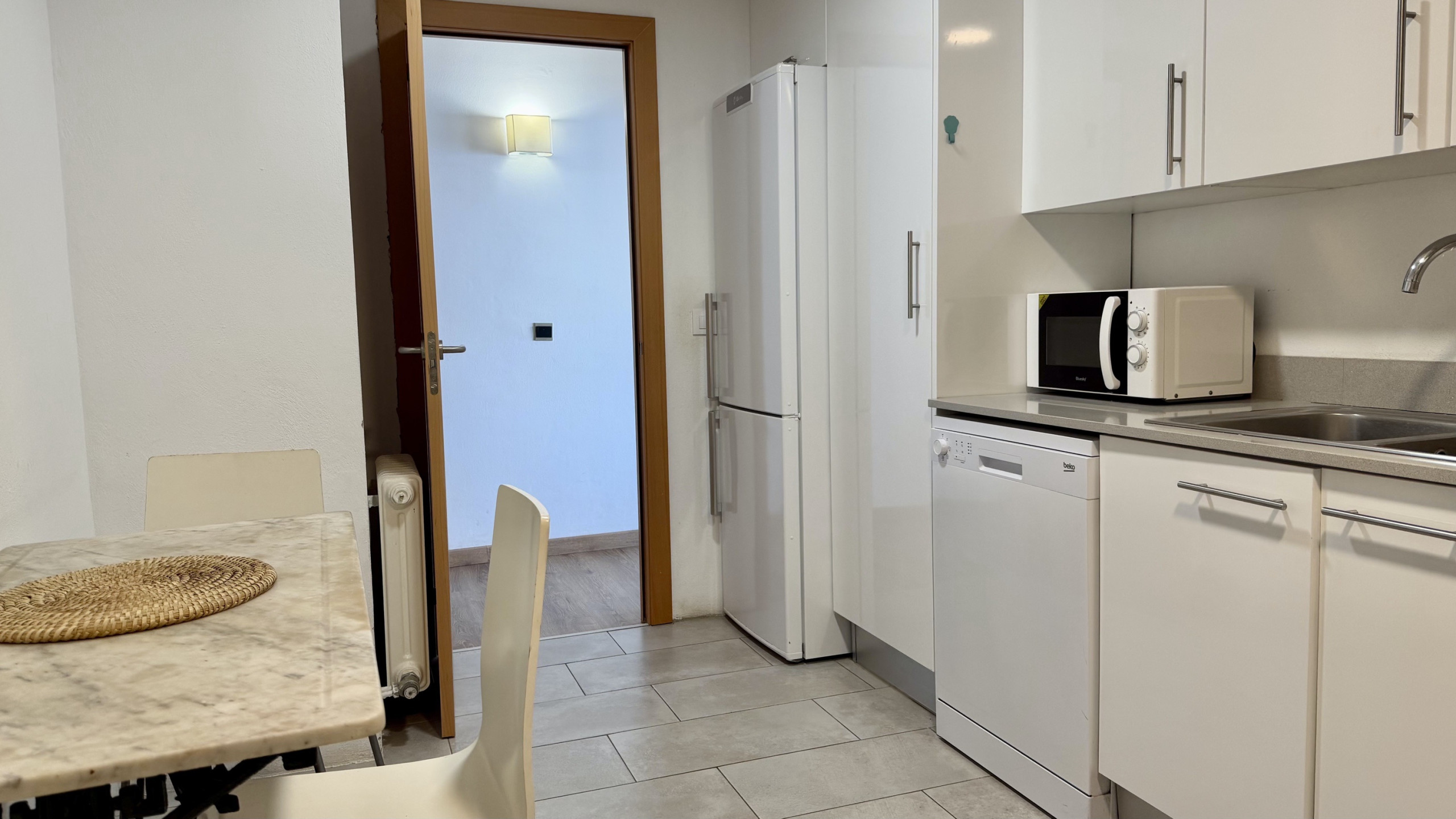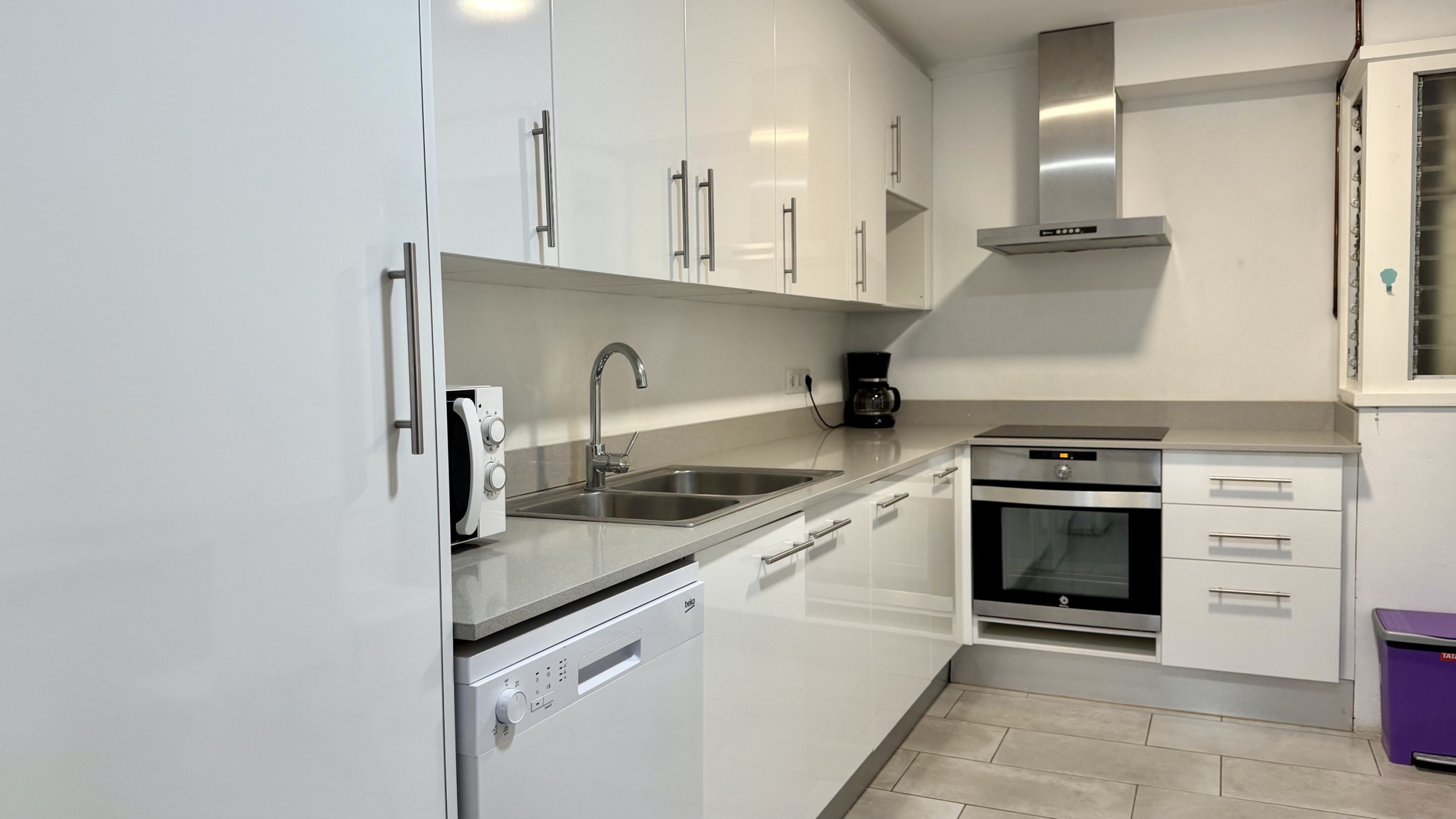 La cuisine indépendante, à vitrocéramique, est équipée avec réfrigérateur, four, congelateur, lave-linge, vaisselle/couvert, ustensiles/cuisine, cafetière et grille pain.