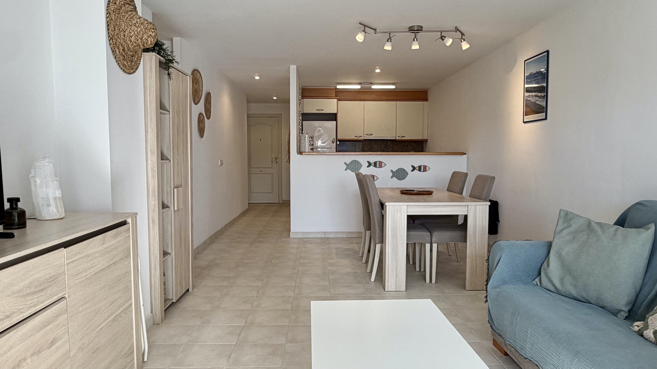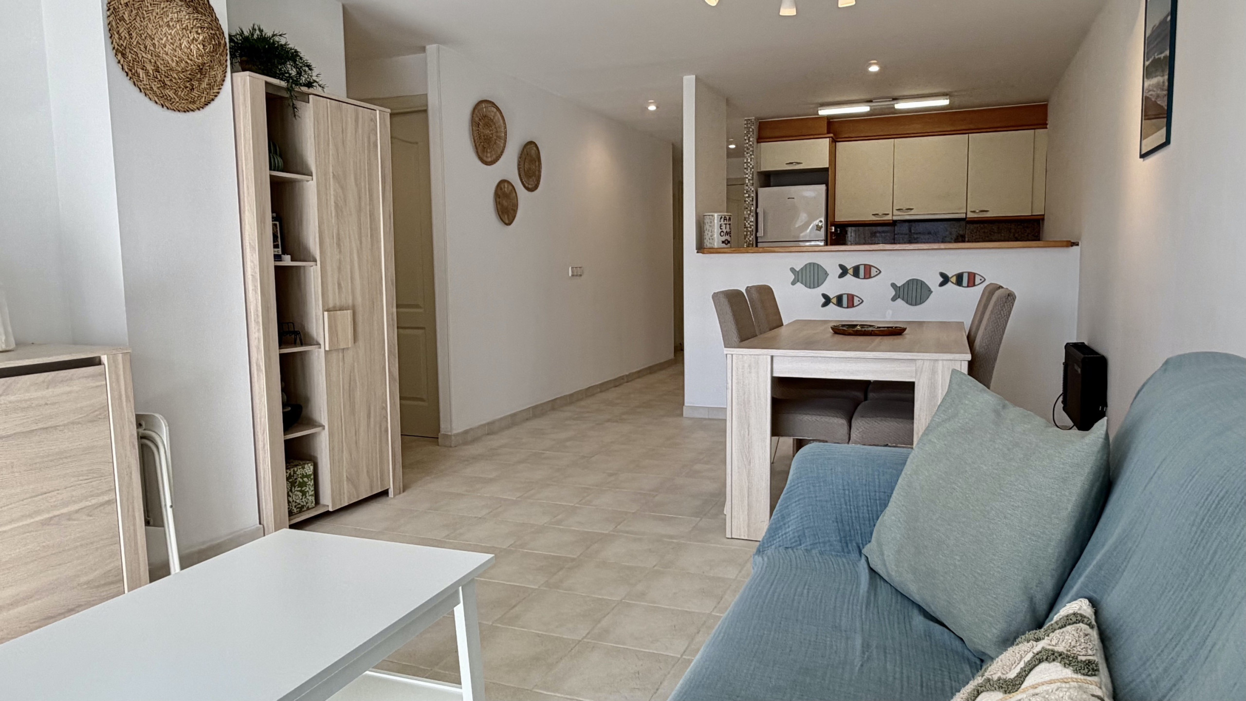 La cuisine américaine est entièrement équipée d'appareils électroménagers modernes, y compris un lave-linge, un lave-vaisselle, un four, un micro-ondes, un grille-pain et une machine à café. Elle dispose d'un réfrigérateur et d'un congélateur pour maintenir les aliments frais pendant le séjour. L'appartement offre 3 lits : un lit double et deux lits individuels, s'adaptant parfaitement aux différentes configurations familiales.