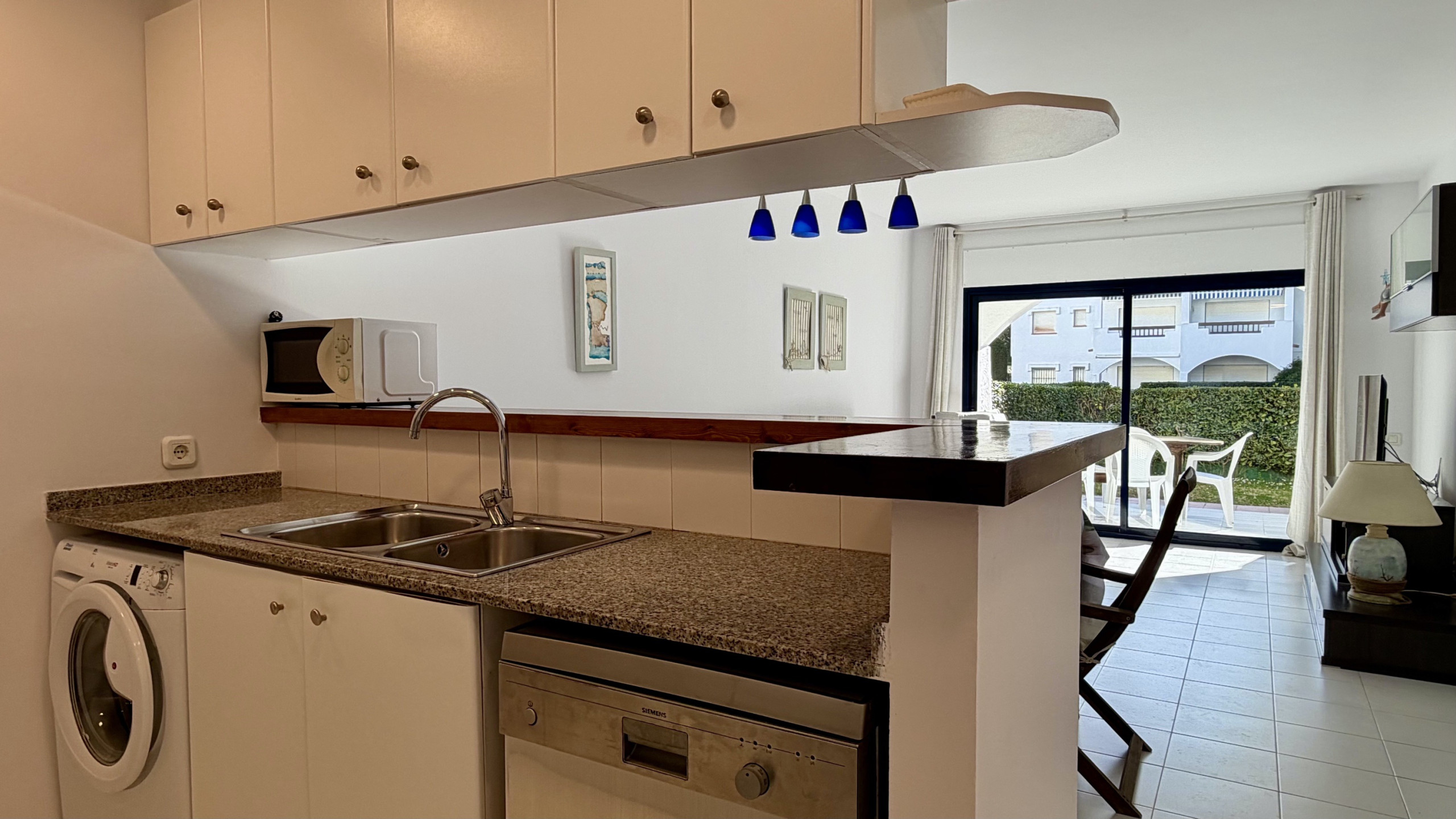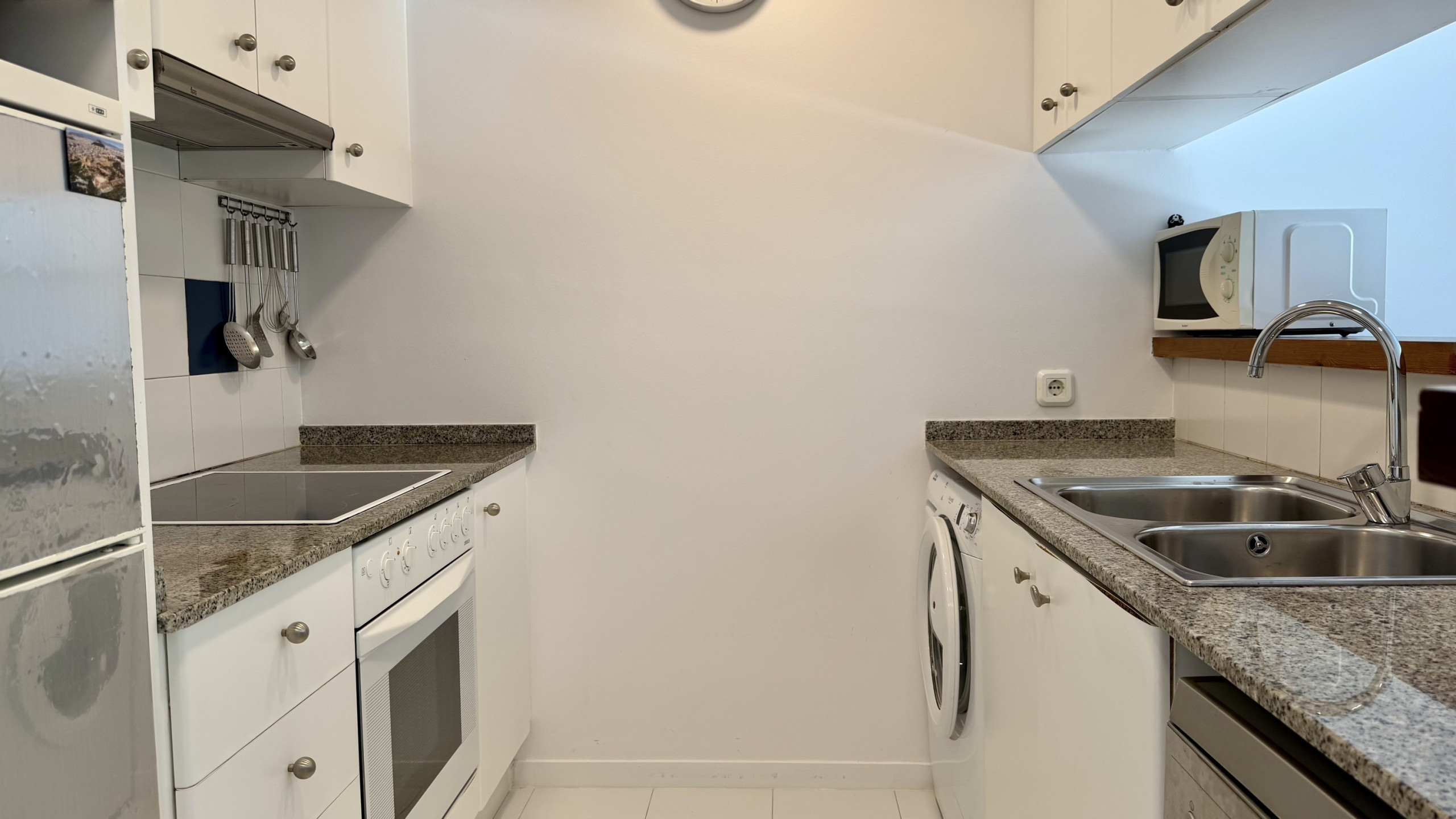 La cuisine américaine, avec une plaque vitrocéramique, est équipée d'un réfrigérateur, d'un micro-ondes, d'un four, d'un congélateur, d'une machine à laver, d'un lave-vaisselle, de vaisselle, de couverts, d'ustensiles de cuisine et d'une cafetière.
