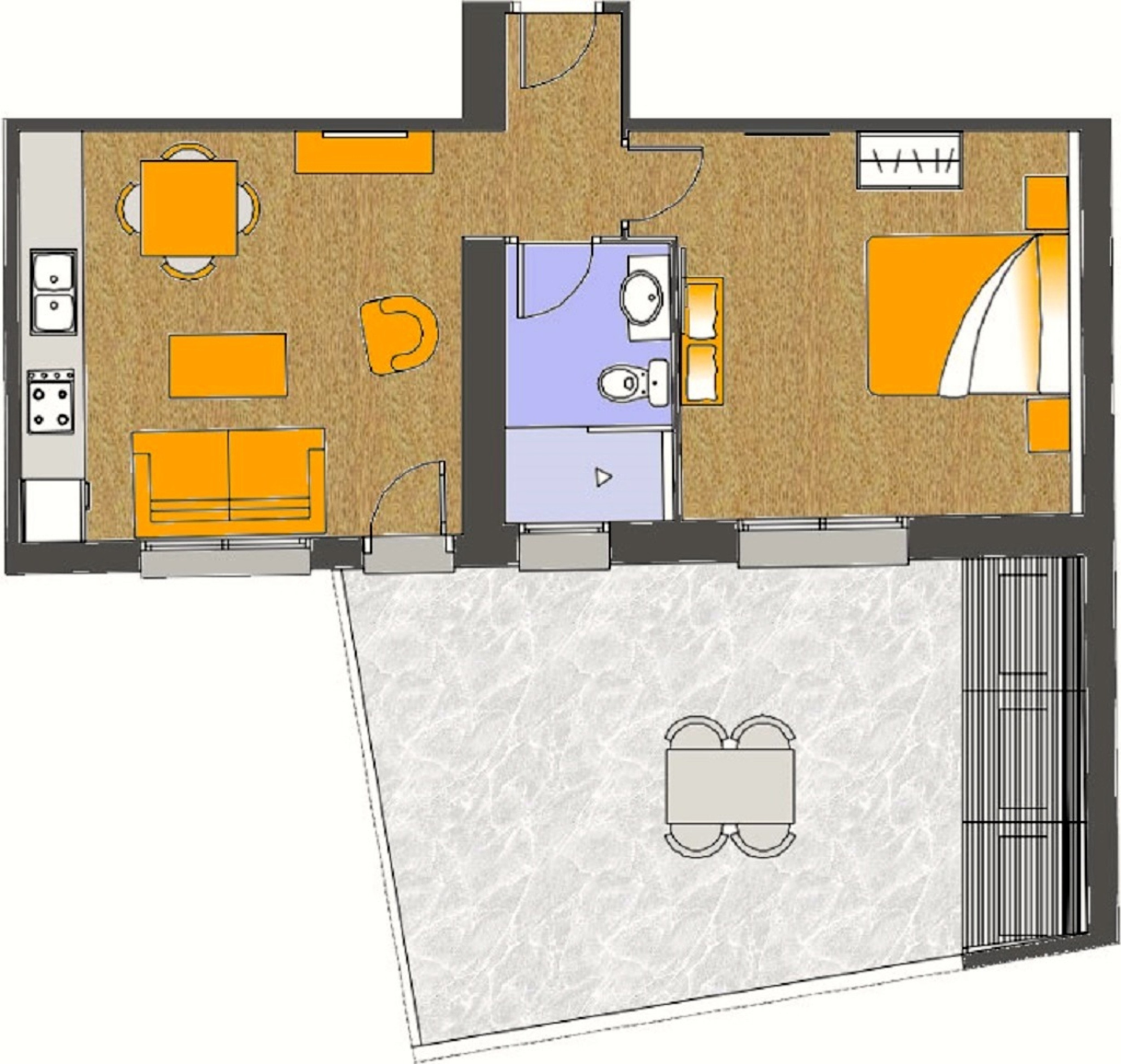 Appartement situé au rez-de-chaussée constitué d’un salon-salle à manger-cuisine, d’une salle de bain, d’une chambre indépendante et d’un patio accueillant de 15 m2.