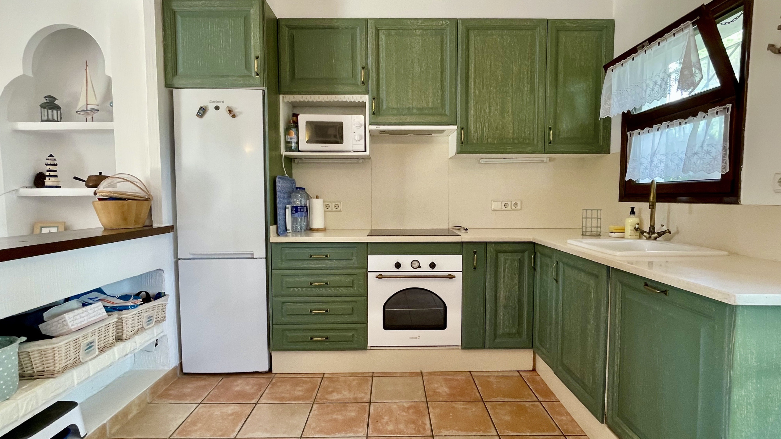 La cuisine, est équipée avec réfrigérateur, micro-ondes, four, congelateur, lave-linge, vaisselle/couvert, ustensiles/cuisine, cafetière et grille pain.