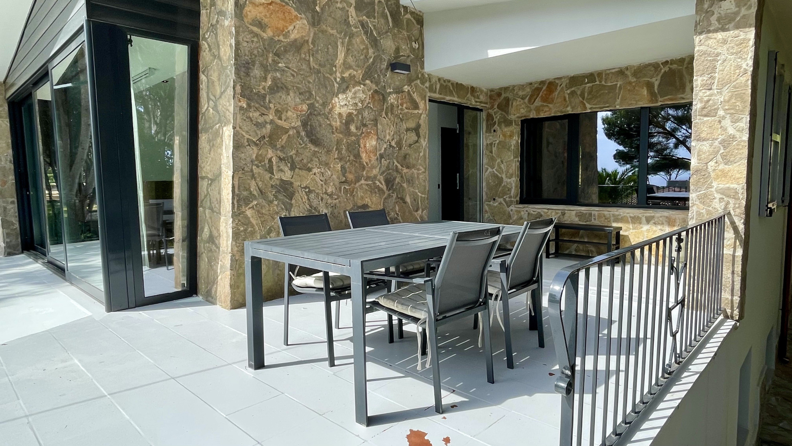 Grand salon avec projecteur, son surround et terrasse avec vue sur la mer